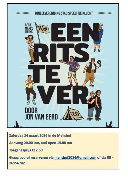 Toneelvereniging Stad komt dan een klucht opvoeren van Jon van Eerd, genaamd "Een rits te ver". Het belooft weer een hele leuke avond te worden!